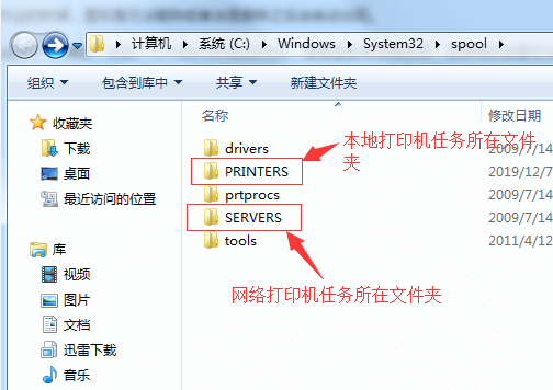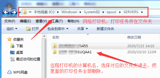 3. 这里要注意本地打印机和网络打印机的任务文件所在的文件夹是不一样的, 【本地打印机 -> “PRINTERS”文件夹】、【网络打印机 -> “SERVERS”】,看看里面有没有东西,如果有的话要把他们全部删除。