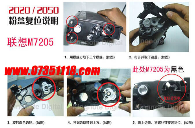 联想2020/2050/M7205在加碳粉后老是提示碳粉量不足,或碳粉用尽,不能打印,这时需要给碳粉盒复位(或称清零), 具体方法可按下图操作,在此提示大家,在加粉时尽量用专用碳粉,在加之前,把废粉清理干净。