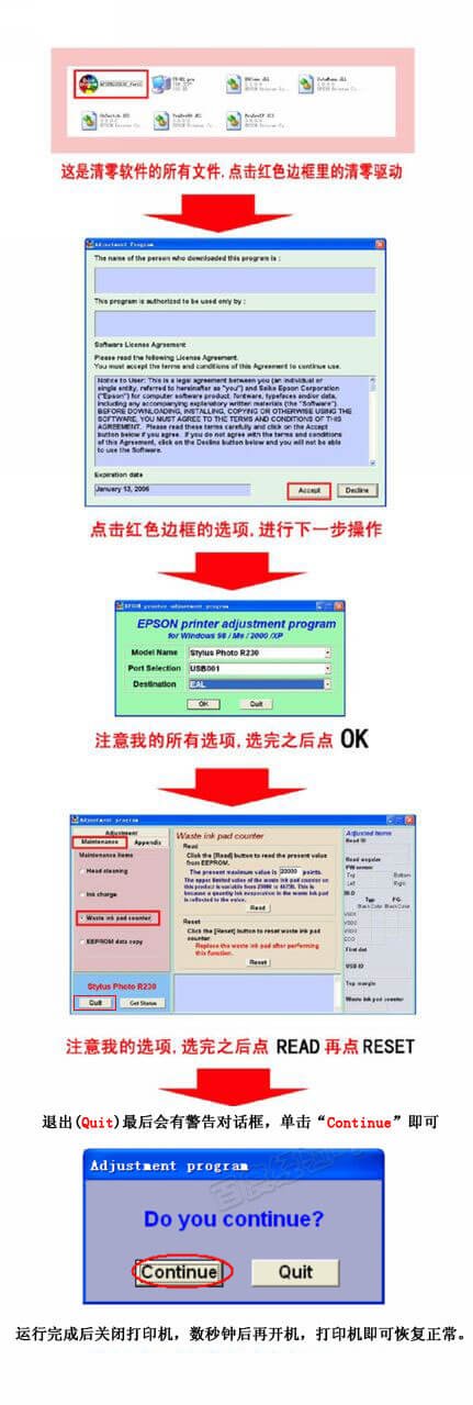 爱普生R230清零软件中文版容易将R230变成R220。而英文版就没有这个毛病