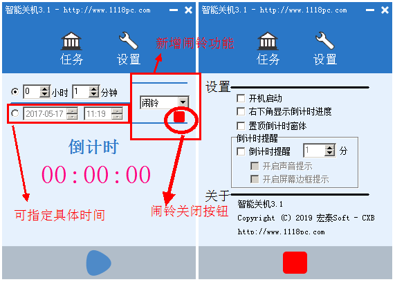 智能关机3.1 1,支持倒计时99小时,指定具体时间 2,支持 闹铃、重启、关机、注销、睡眠、待机、休眠 、关显示器、锁定、断开ADSL; 3,设置功能 开机启动、 右下角显示倒计时进度、置顶倒计时窗体、 倒计时提醒(开启声音提示,开启屏幕边框提示);