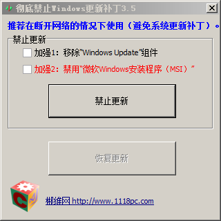 1. 先不勾选 移除"Windows Update"组件 复选框,点 禁止更新,重启电脑。