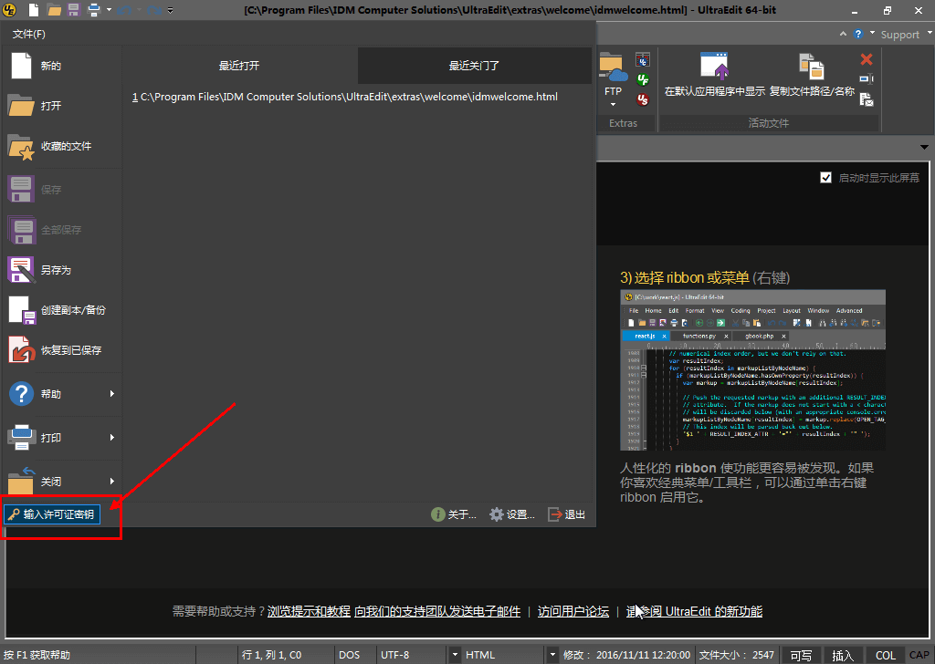 2、把网络断开,必须断开,否则无法激活!打开UltraEdit -> 文件 -> 输入许可证密匙。