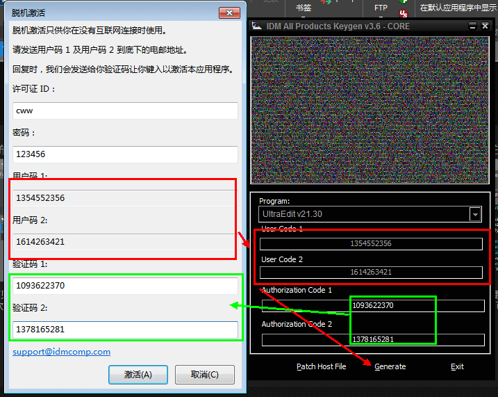 5、许可证和密码随便写,复制用户码1和2到注册机 -> Generate,然后把 Code 1和2 复制到 验证码1和2处,点激活。