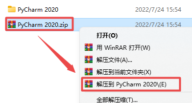 1.选中下载的压缩包,然后鼠标右键选择解压到"PyCharm 2020"