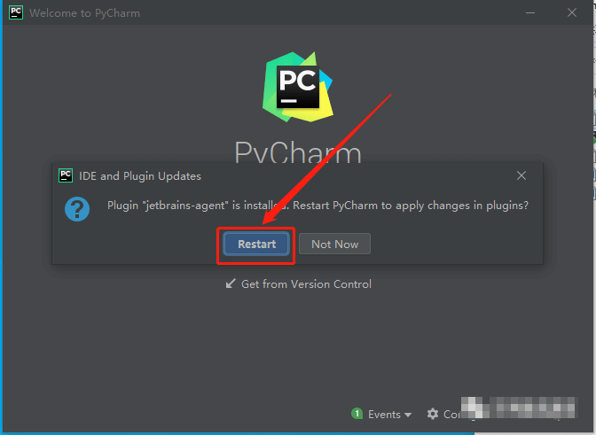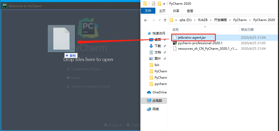 13.返回之前解压的“PyCharm 2020”文件夹,将”jetbrains-agent.jar”文件拖动到PyCharm打开的界面中