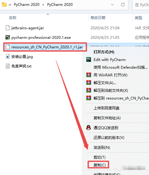 18.返回之前解压的“PyCharm 2020”文件夹,找到并选中“resources_zh_CN_PyCharm_2020.1_r1.jar”文件,鼠标右键选择“复制’