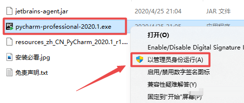 2.打开刚刚解压的文件夹,鼠标右键点击“pycharm-professional-2020.1.exe”选择“以管理员身份运行”