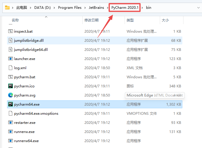 20.在打开的文件夹路径栏,点击“PyCharm 2020.1”