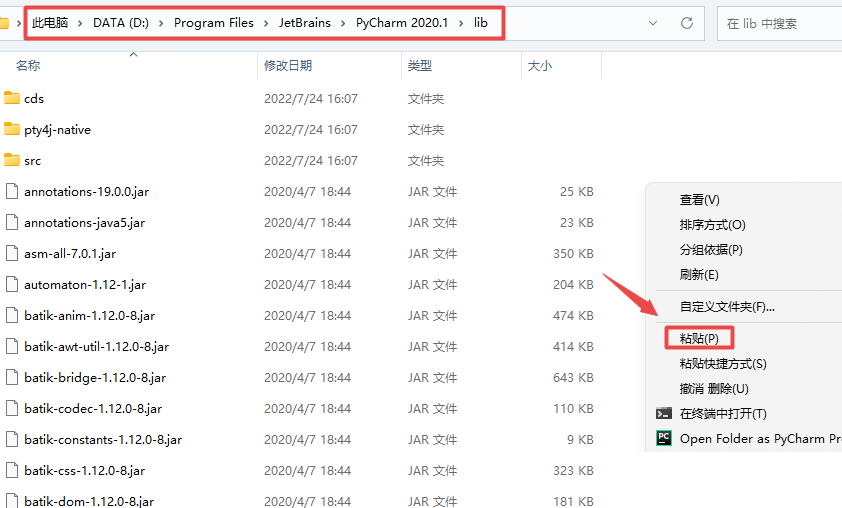 22.在打开的”lib“文件夹空白处,鼠标右键“粘贴”刚才复制的文件
