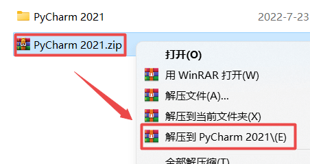 1.选中下载的压缩包,然后鼠标右键选择解压到"PyCharm 2021"