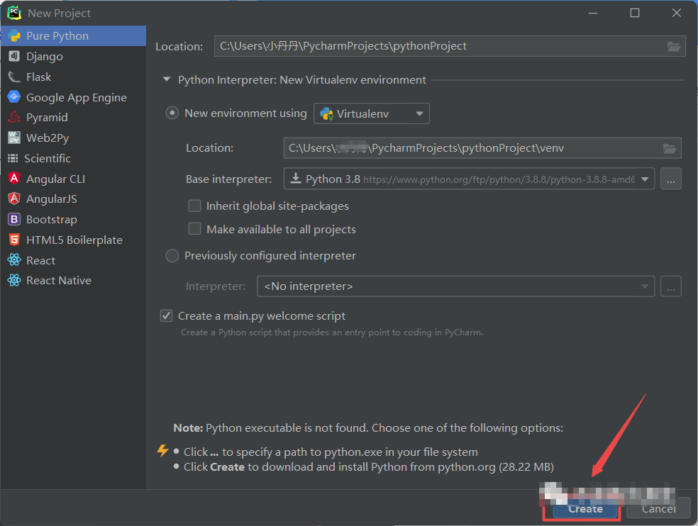 20.文件存放位置和环境,点击“Create“