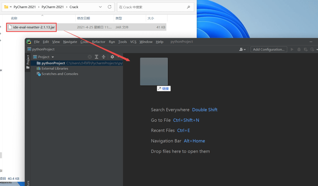 17.返回之前解压的“PyCharm 2021”文件夹,双击打开“Crack”文件夹,将”ide-eval-resetter-2.1.13”文件拖动到PyCharm打开的界面中
