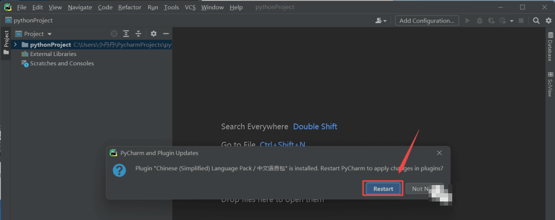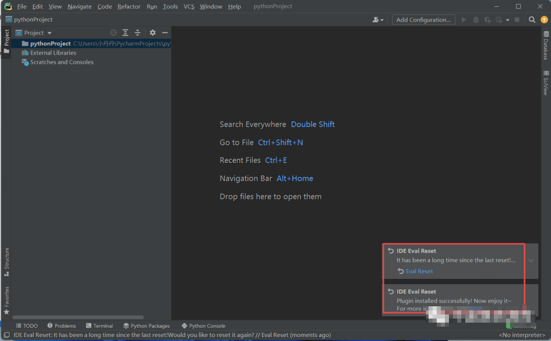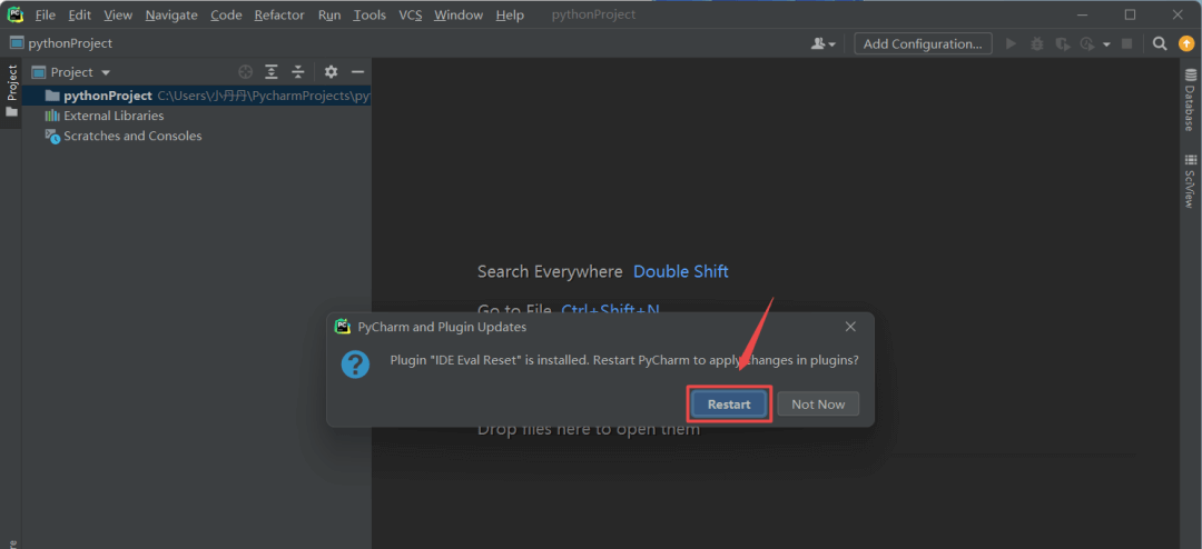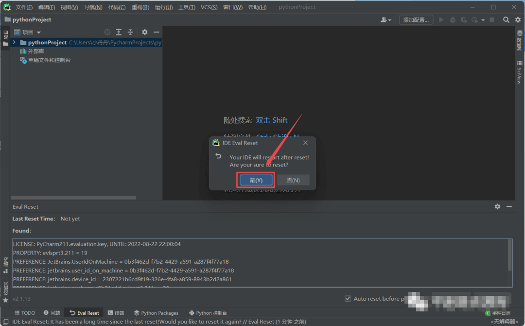 18.提示“IDE Eval Reset“,再次将”ide-eval-resetter-2.1.13”文件拖动到IPyCharm打开的界面中,点击“Restart“,程序将自动重启