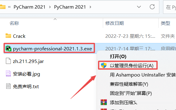 2.打开刚刚解压的文件夹,鼠标右键点击“pycharm-professional-2021.1.3.exe”选择“以管理员身份运行”