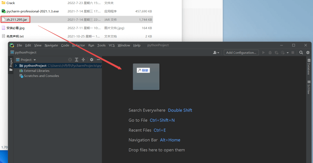 19.返回之前解压的“PyCharm 2021”文件夹,将”zh.211.295.jar”文件拖动到PyCharm IDEA打开的界面中