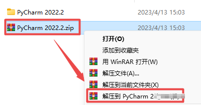 1.选中下载的压缩包,然后鼠标右键选择解压到"PyCharm 2022.2"