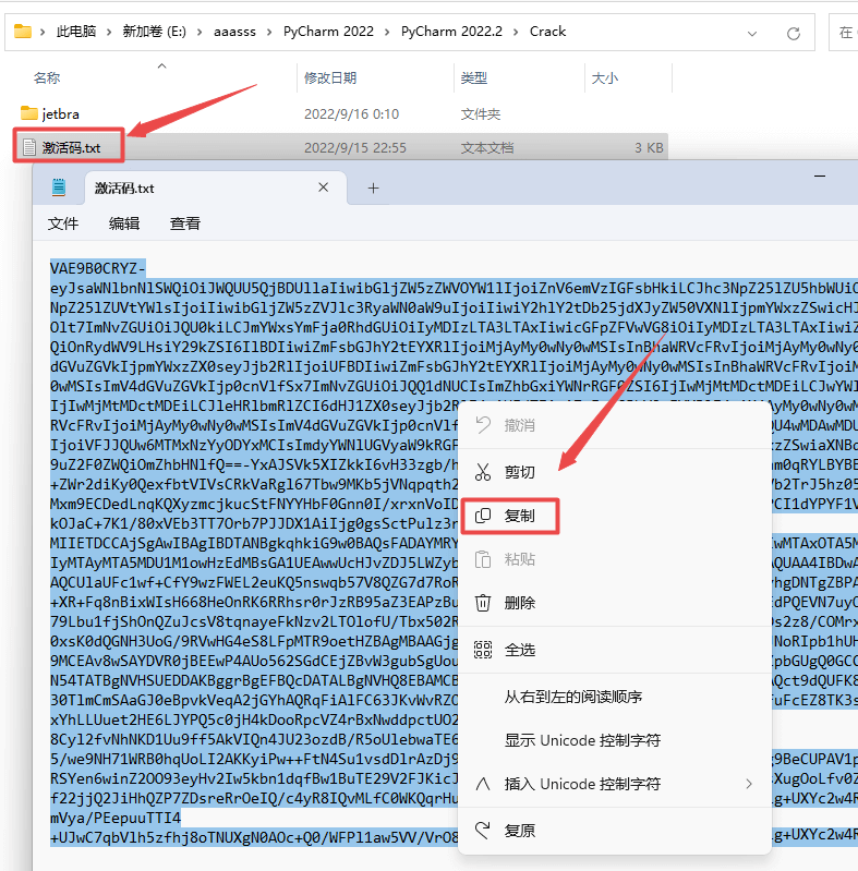 16.返回之前解压的“PyCharm 2022.2”文件夹,双击打开“Crack”文件夹,再打开”激活码“文件,全部选中打开文本中的激活码,鼠标右键点击“复制”
