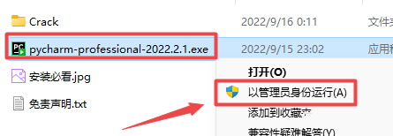 2.打开刚刚解压的文件夹,鼠标右键点击“pycharm-professional-2022.2.1.exe”选择“以管理员身份运行”