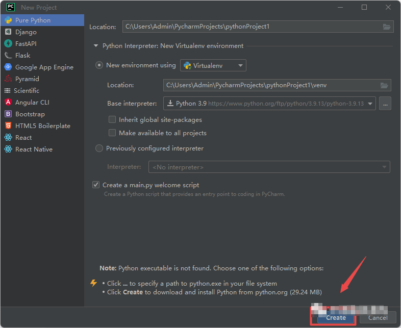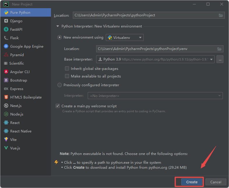 21.文件存放位置和环境,点击“Create“