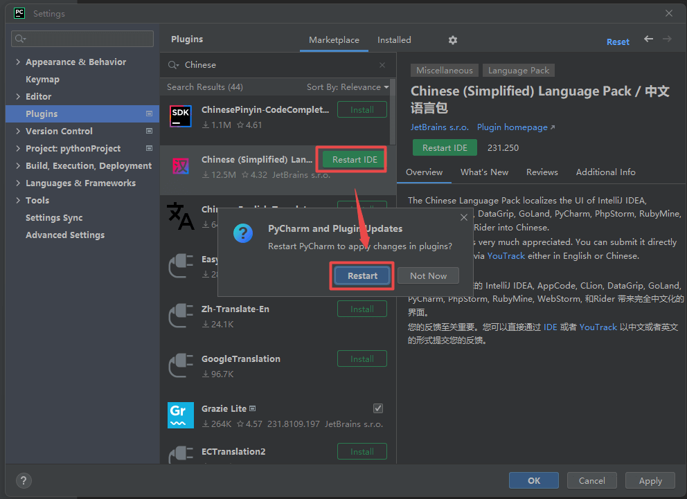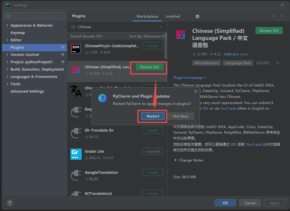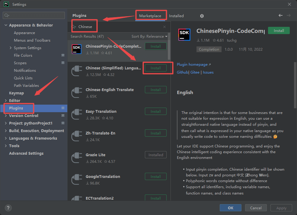 24.点击“Plugins“,点击“Marketplace“,输入:Chinese,找到“Chinese(simplified)“,点击“install“,等待下载安装