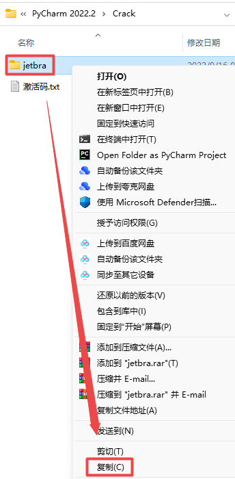 9.返回之前解压的“PyCharm 2022.2”文件夹,双击打开“Crack”文件夹,鼠标右键点击“jetbra”文件夹选择“复制”
