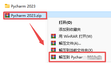 1.选中下载的压缩包,然后鼠标右键选择解压到“Pycharm 2023”