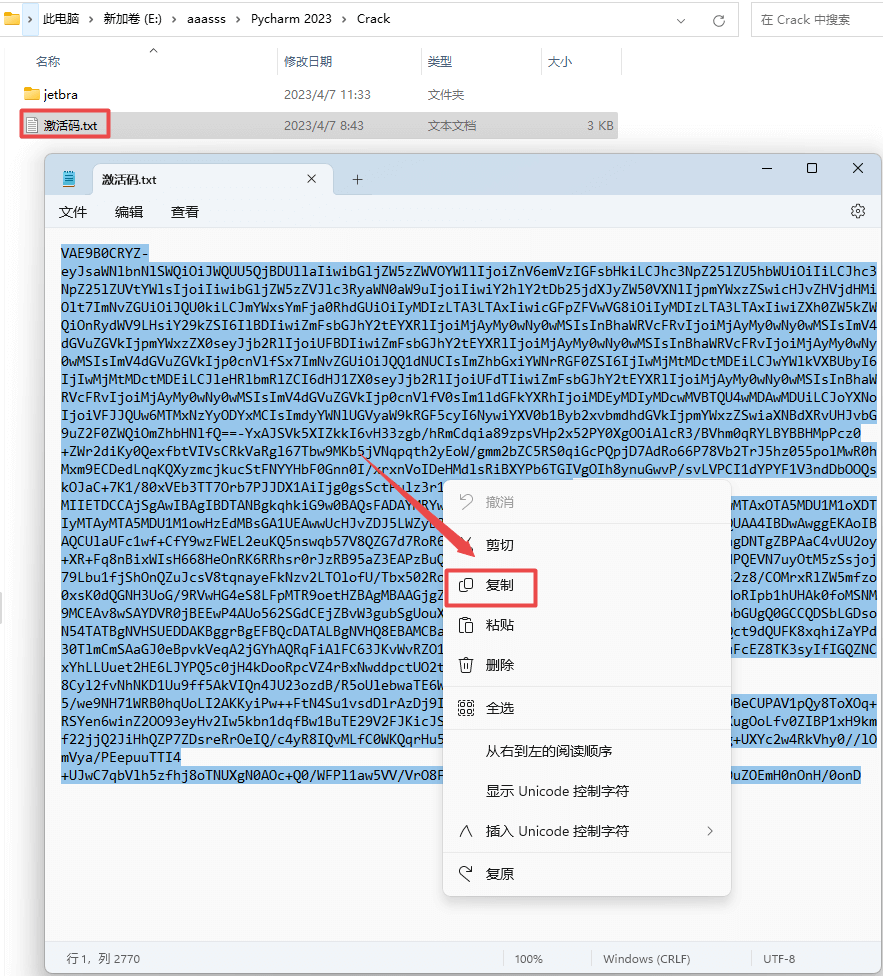 17.返回之前解压的“PyCharm 2023”文件夹,双击打开“Crack”文件夹,再打开”激活码“文件,全部选中打开文本中的激活码,鼠标右键点击“复制”