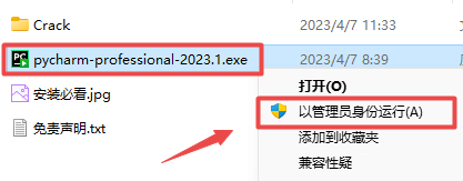 2.打开刚刚解压的文件夹,鼠标右键点击“pycharm-professional-2023.1.exe”选择“以管理员身份运行”
