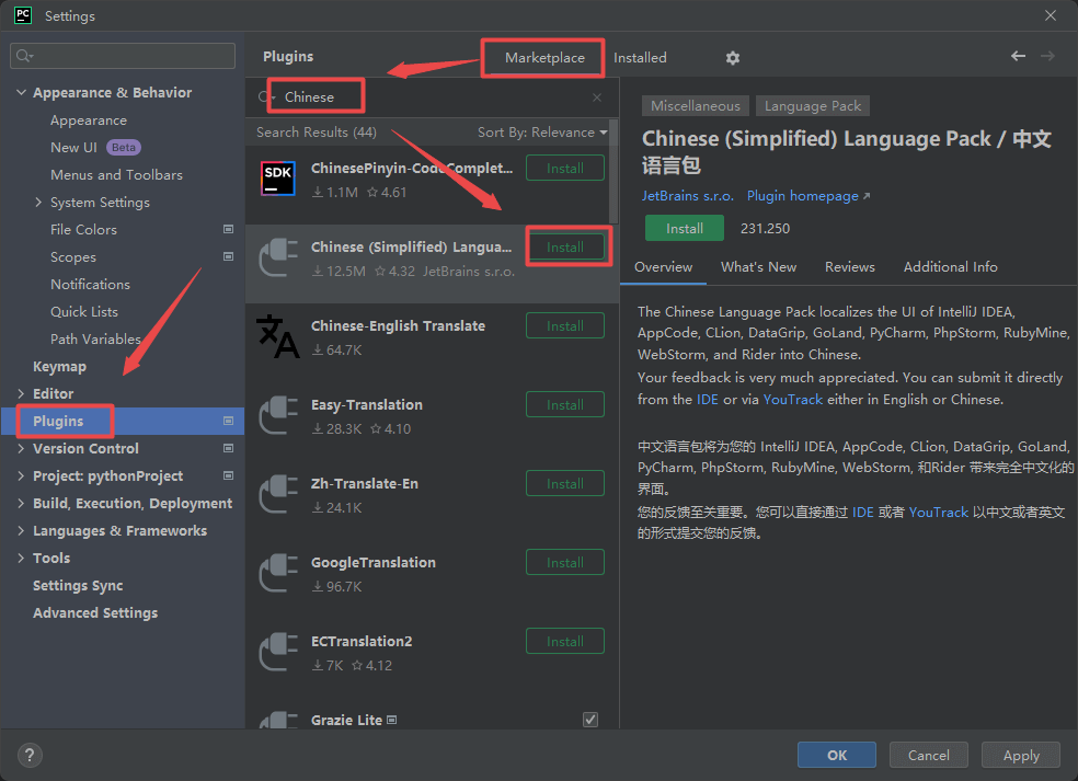 23.点击“Plugins“,点击“Marketplace“,输入:Chinese,找到“Chinese(simplified)“,点击“install“,等待下载安装