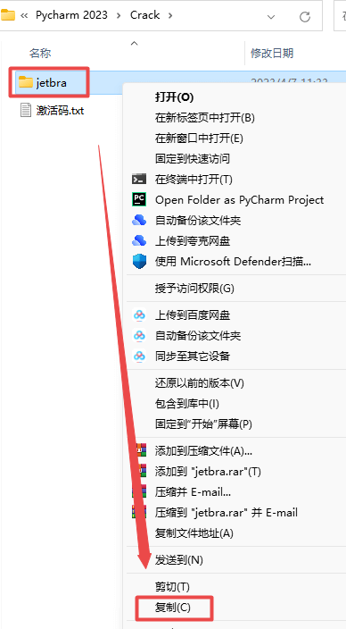9.返回之前解压的“PyCharm 2023”文件夹,双击打开“Crack”文件夹,鼠标右键点击“jetbra”文件夹选择“复制”