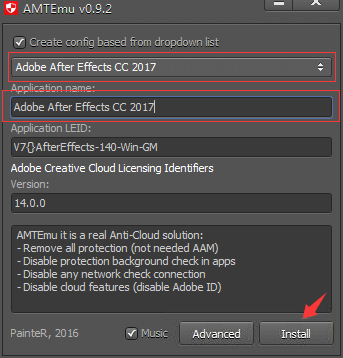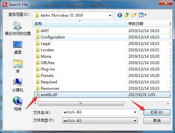 5. 选中后点击注册机右下角的Install,然后会跳出文件资源管理器让你找一个dll文件。如果是默认路径就打开C:\Program Files\Adobe\Adobe Photoshop CC 2018,找到后选择软件根目录下的amtlib.dll ,双击打开